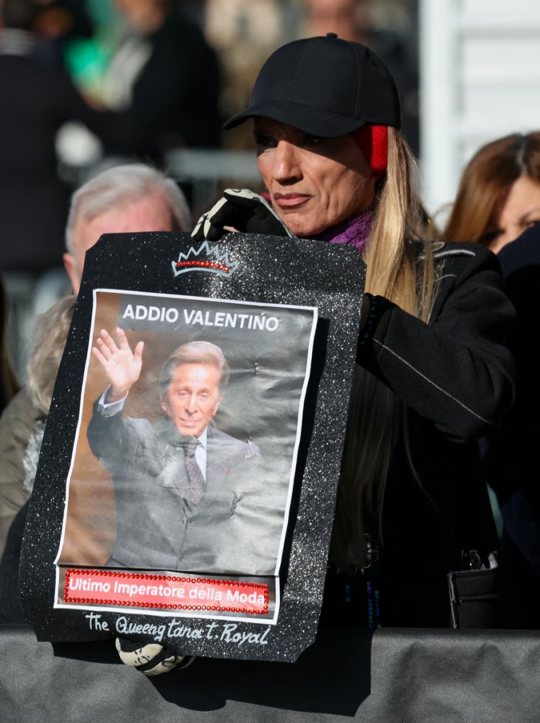 Në mesin e të ftuarve ndodheshin emra të shquar si Anne Hathaway, Olivia Palermo, Anna Wintour, Tom Ford, Maria Grazia Chiuri, Alessandro Michele dhe Pierpaolo Piccioli, të cilët erdhën për të nderuar ikonën që për më shumë se gjysmë shekulli i dha formë elegancës italiane. Qytetarë të shumtë u rreshtuan jashtë bazilikës, shumë prej tyre të veshur me të kuqe – ngjyra simbol e trashëgimisë Valentino-s. Kurorat me lule të bardha, pankartat e adhuruesve dhe prania e personaliteteve nga e gjithë bota e modës e kthyen këtë ceremoni në një tribut të denjë për një nga “mbreterit e fundit të modës”, i cili la një gjurmë të përjetshme në historinë e stilit dhe artit.