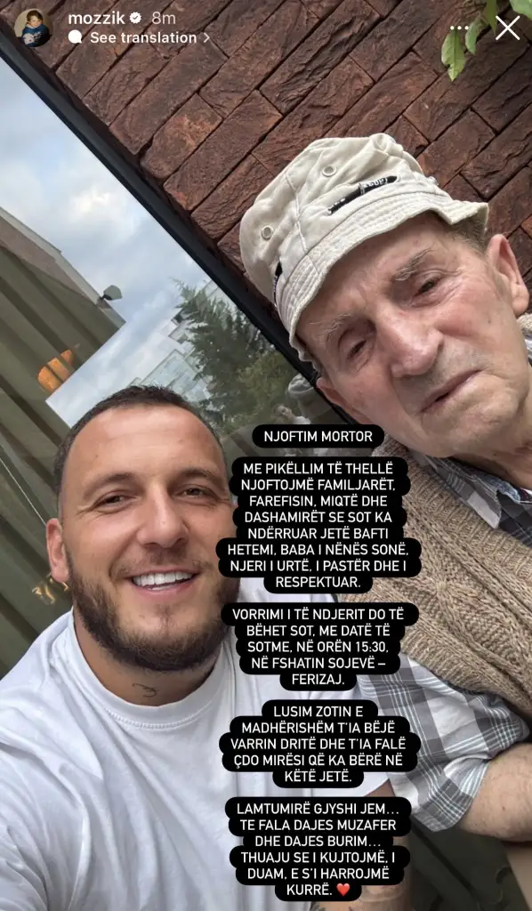 Familja e reperëve të njohur Mozzik dhe Getinjo po kalon një moment të rëndë zie, pasi është ndarë nga jeta gjyshi i tyre, Bafti Hetemi. Lajmi u bë i ditur nga vetë Mozzik, i cili përmes një postimi të ndjerë në rrjetet sociale tregoi dhimbjen e familjes dhe respektin e thellë që kishin për gjyshin. Ai e përshkroi si një njeri të ndershëm, të urtë dhe të dashur, i cili la gjurmë të mëdha te të gjithë ata që e kishin njohur. Ceremonia e varrimit do të mbahet sot, në orën 15:30, në fshatin Sojevë të Ferizajt, ku familja dhe miqtë do t’i japin lamtumirën e fundit.